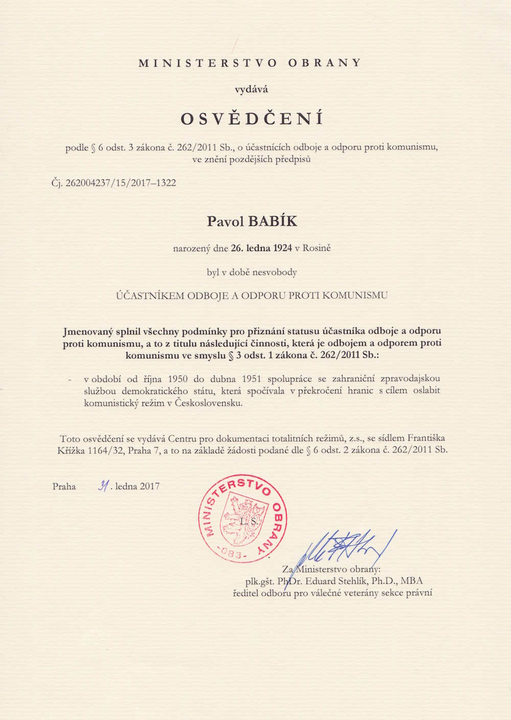 1. Pavol Babík, nar. 26. 1. 1924 v Rosině, čj. 262004237/15/2017-1322