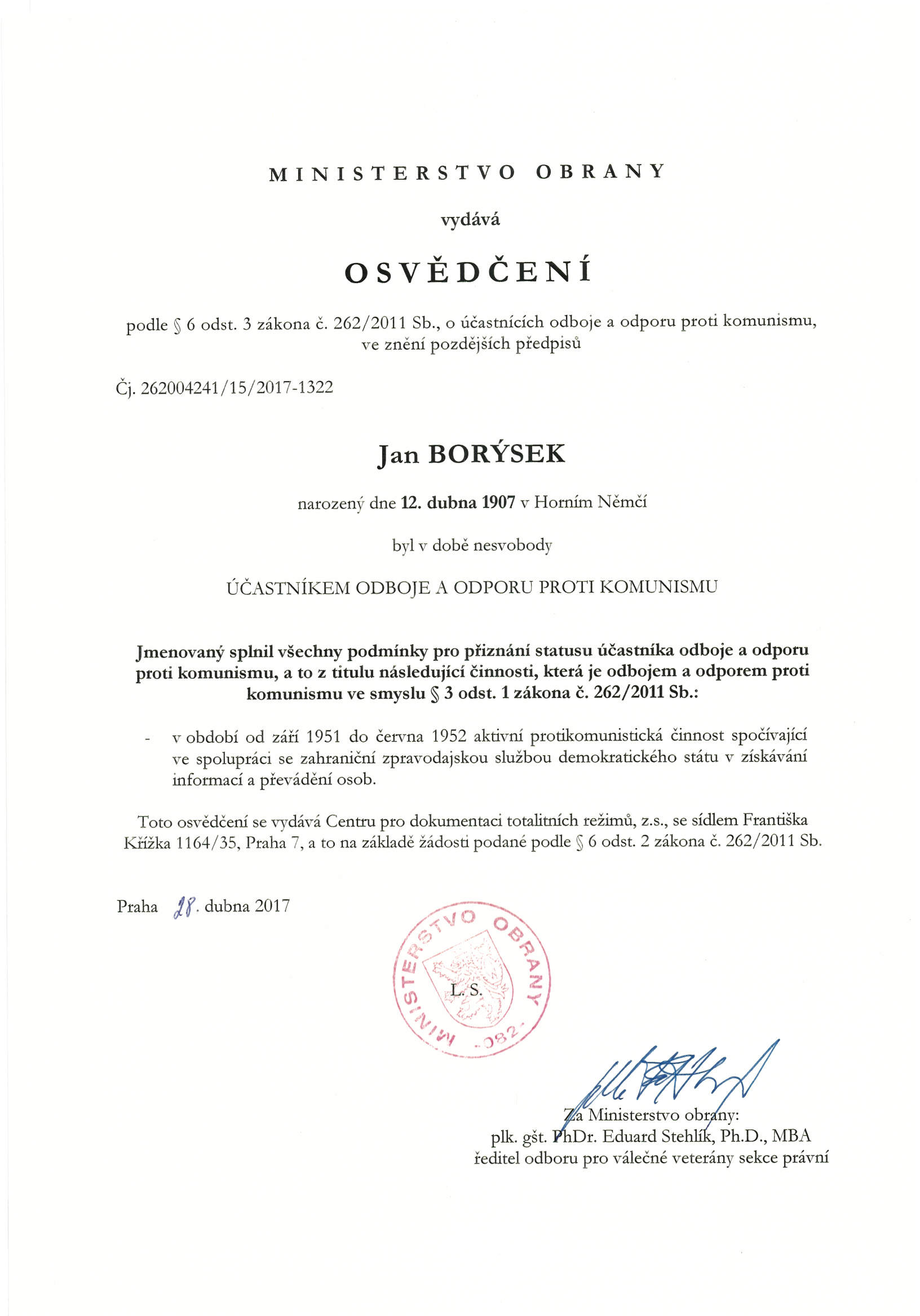 6. Jan Borýsek, nar. 12.4.1907; v Horním Němčí, čj. 262004241/15/2017-1322