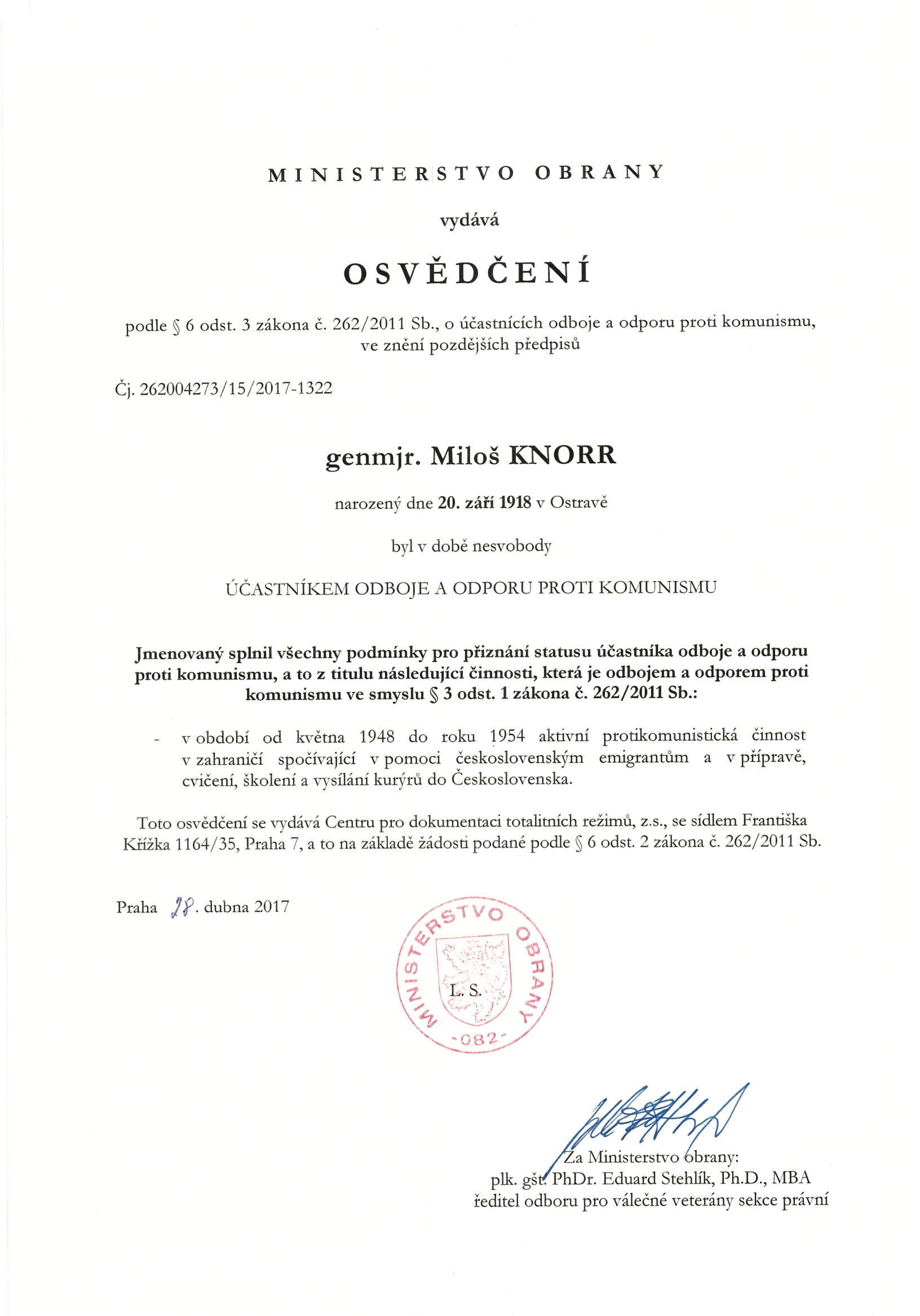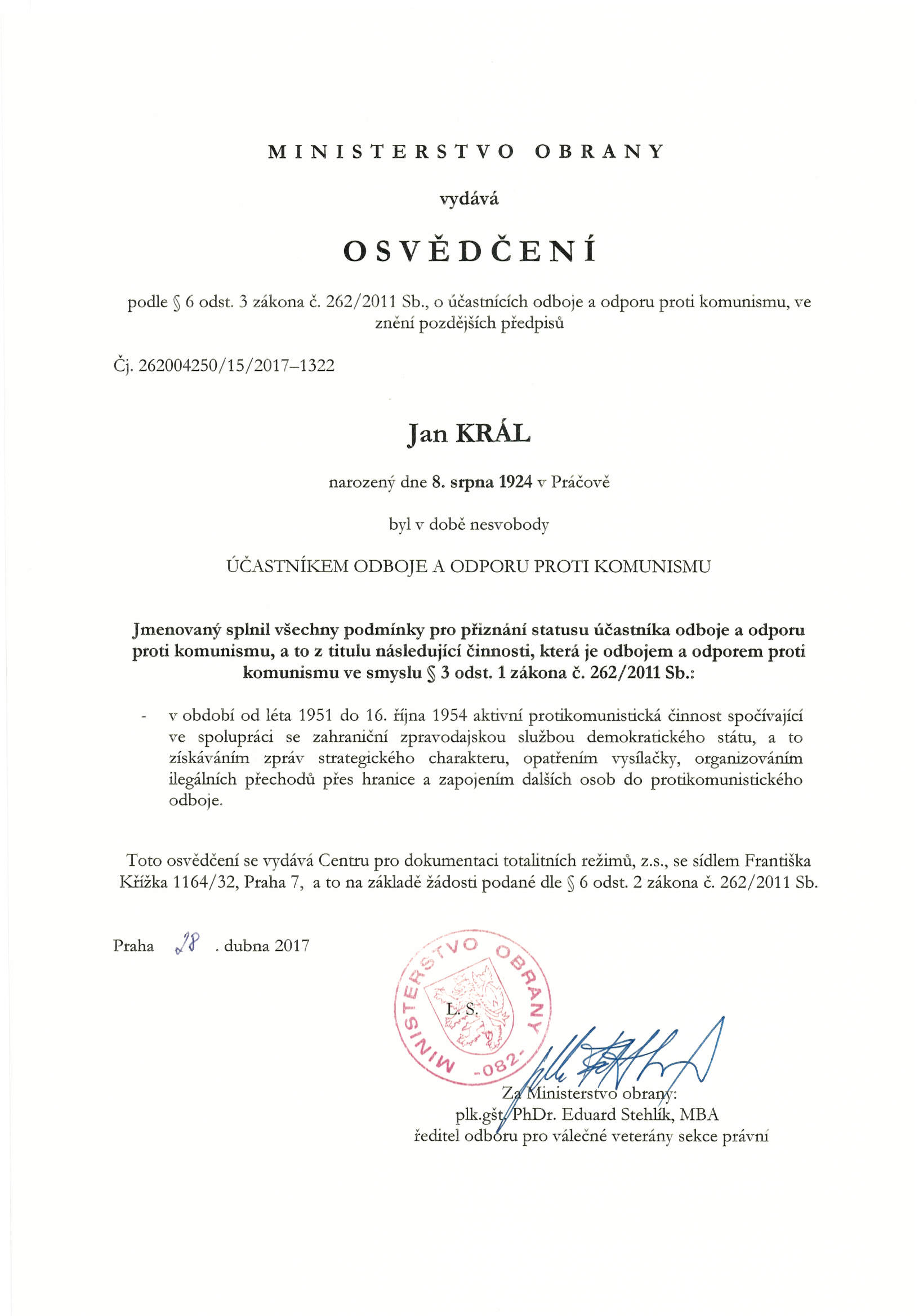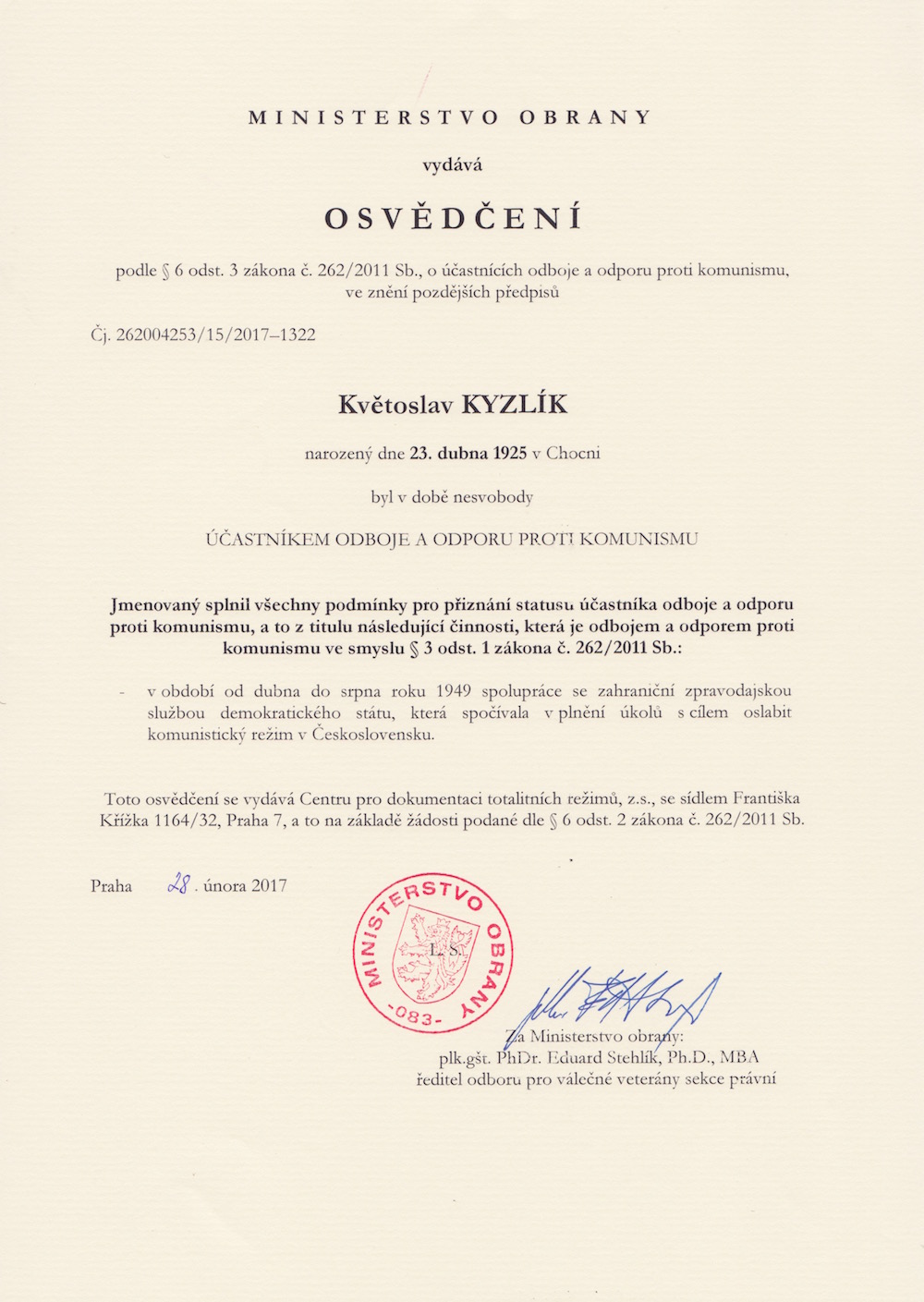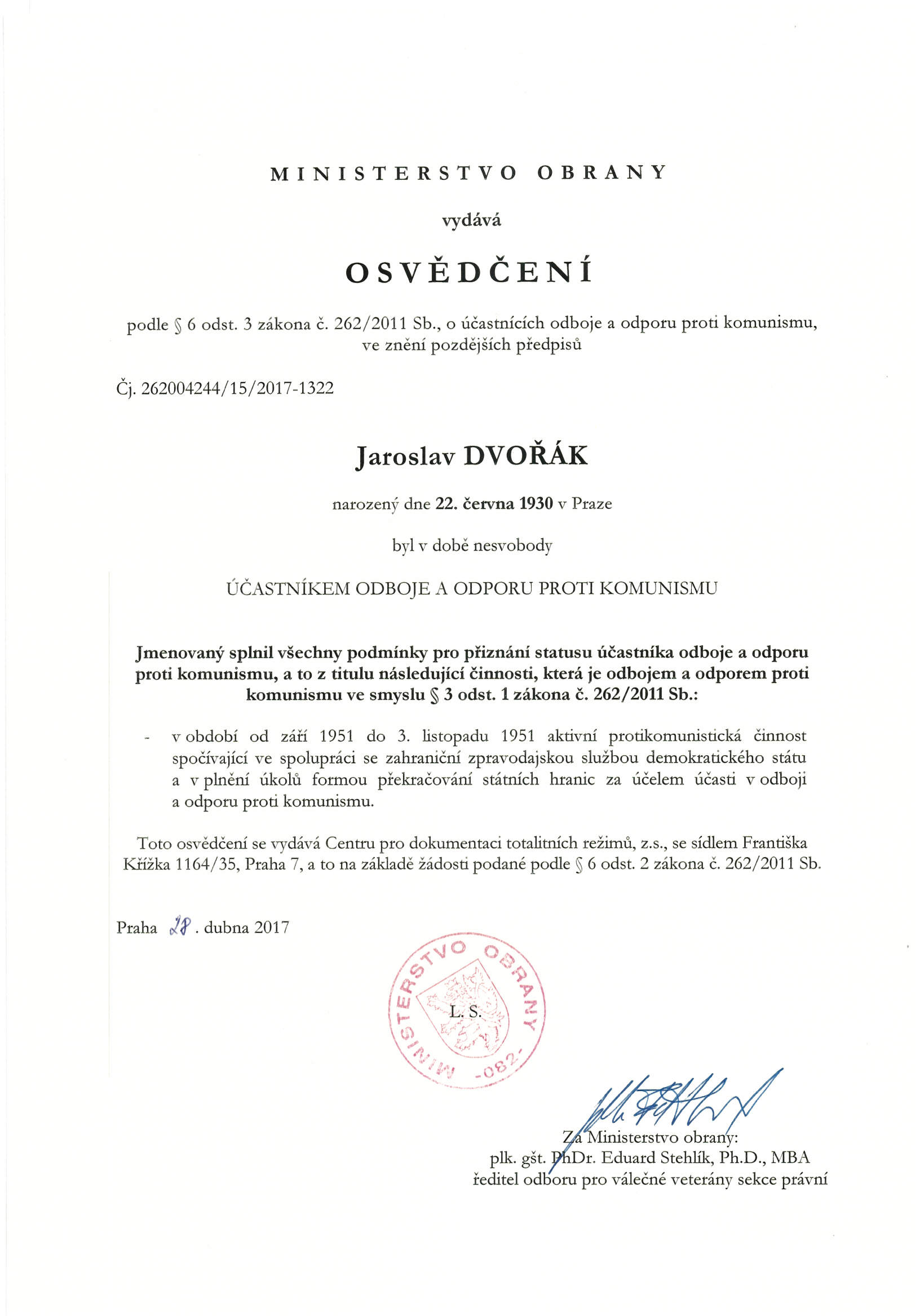 Praha, 26. květen 2017 (aktualizace) - Ministerstvo obrany České republiky informovalo Centrum pro dokumentaci totalitních režimů, že správní řízení prokázalo opodstatněnost žádostí CDTR o vydání osvědčení dle zákona č. 262/20111 Sb. o účastnících odboje a odporu proti komunismu, ve znění pozdějších předpisů.