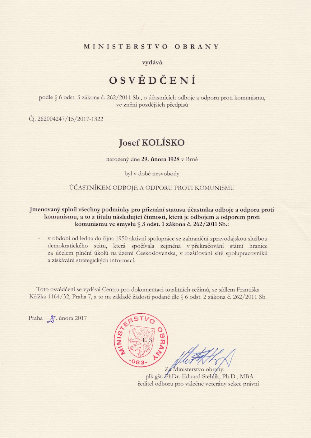 3. Josef Kolísko, nar. 29. 2. 1928 v Brně, čj. 262004247/15/2017-1322