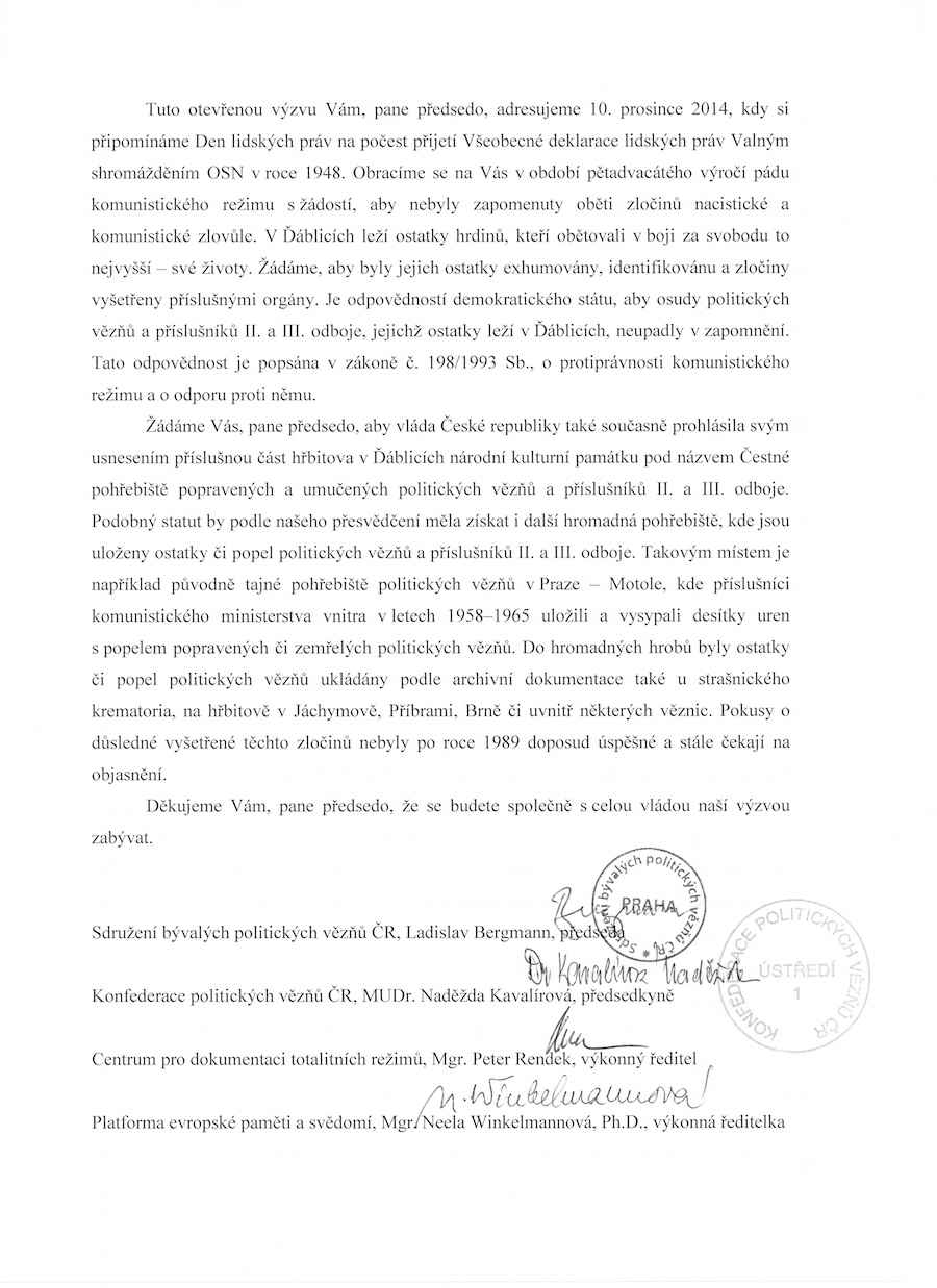 V prosinci 2014 jsme odeslali žádost předsedovi vlády ČR panu Bohuslavu Sobotkovi ve věci hromadného pohřebiště politických vězňů, příslušníků II. a III. odboje a dalších osob v Ďáblicích. Dopis byl podepsán představiteli Konfederace politických vězňů ČR, Sdružením bývalých politických vězňů ČR, Platformy evropské paměti a svědomí a Centra pro dokumentaci totalitních režimů. Dne 10. prosince 2014 byl Petr Blažek z posledně jmenované organizace hostem Studia ČT 24 na téma: Pohřebiště v Ďáblicích by mělo být prohlášeno národní památkou. O iniciativě přinesla zprávu také další média, která vycházela ze zprávy ČTK. Výzvu společně s odpovědí pana předsedy vlády publikujeme níže.